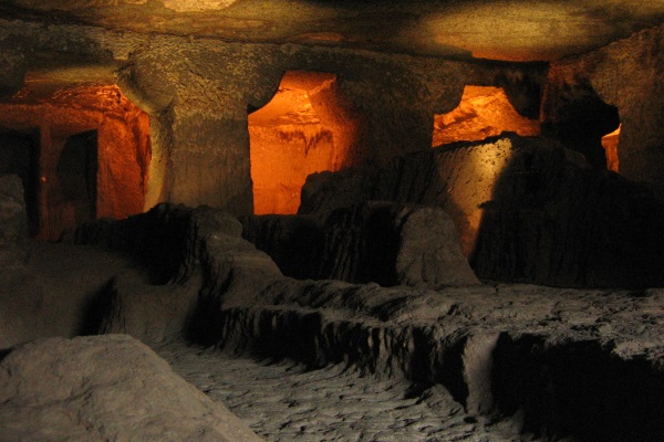 Across the river the path led along the base of the hill facing the caves, all the way to the far end where the hill facing us culminated in a waterfall area topped by a box canyon. This little nook was an extremely charming, romantic and exciting place and it was a real pity that the waterfall was entirely dry. There was only a little trickle rolling disconsolately off the rock, as though from a leaky tap. There seemed to be a man-made arch in the rocky caves tucked away in the magical little box canyon above and behind the waterfall. This area would be idyllic in the rainy season. There were steps leading up this hill and a small lookout at the top. We panted up the 300-odd steps and were rewarded with sweeping views of the Ajanta caves, the dry waterfall and box canyon above it, the flat tableland at the top, and a bonus glimpse of an unsuspected cave sitting just above the main series of caves, apparently quite inaccessible. A trinkets salesman who was making his way down, after trying to sell us his wares (and failing), informed us that there was a path that led all along the top of the hill and came down near the ticket counter. We didn’t feel energetic enough to follow the path, so after we had gazed around sufficiently, we descended the same way and took one of three bridges across the dry river bed to the caves. There was much to see and admire, but what grabbed my imagination and held me spellbound was an unfinished cave. I had seen some unfinished caves at Ellora already, but this one was magnificent in its incompleteness. Huge blocks of rock rose off the floor, roughly hewn. The pillars were nothing more than chunks of rock connecting the floor and ceiling, with gaping holes separating them from other pillars. Cells had been hollowed out in the side walls – low, narrow doorways with small, scooped out cubicles inside. Orange light had been rigged up in unexpected crannies, and threw its burning flame of light up the walls and behind the pillars as though several fires had been mysteriously lit in secret recesses. Somehow, they made it seem not warm, but cold, at least in mood, if not in temperature. It was silent – the noisy tourist crowd was a world away. It felt ominous, almost evil. Was this the lair of some sinister power, or some terrible creature lurking in the depths casting deadly spells on me to lure me to my doom? I felt a great need to be silent, a great dread of going deeper in; yet I was drawn onwards irresistibly by a combination of fear and fascination. It was as though I was in a dream which was on the very verge of turning from an Indiana Jones style adventure story to a bone chilling, horror-filled nightmare.