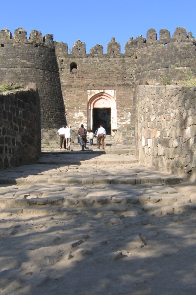 The region has a chequered history. It was ruled by a series of kings, from the Hindu Yadava rules to the Islamic Khilji and Tughlaq dynasties. In these turbulent times, between 1100 and 1700 AD, the fort was built, a product of many generations. In some ways it is reminiscent of the forts of Delhi, most notably Ferozeshah Kotla, but superficial resemblances notwithstanding, it is unique in many ways. It uses every trick in the book in its self defense – and it writes a few good ones too. The first line of defence is the series of battlemented walls, so broad that you could parade along them in threes. Next are the gates, protected by doors studded with iron spokes, inviting no nonsense from anyone. Just behind the doors, there are sentry rooms, where, in times of attack, you can imagine hordes of soldiers waiting, ready to spring forth should the sturdy door give way.