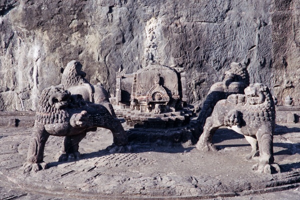Cave 32 is known as the Indra Sabha cave and is the most famous of the Jaina caves. A small group of tourists was just entering it, so we went to Cave 34 first, which was deserted. There was a staircase just off the entrance hall and I climbed up it almost absent-mindedly, leaving Amit in the depths of 34. The stairs led, to my surprise, up to unseen halls and staircases I had not suspected, and thence, after a short passage brought me to the top storey of Cave 32. These pillared halls were breathtakingly beautiful, softly carved and glowing softly like warm gold in the late afternoon sunlight. There was a sense of peace and quietude here that was not to be found in the crowds milling around Kailasha or any of the more central caves. At last we walked back down the tarred road, towards the Brahminical caves. Cave 29 was a short diversion away, but we wanted to be back at Kailasha and adjacent caves to take advantage of the burnishing light of sunset to get a few good pictures, so we skipped this for the moment, intending to come back to it the next day. I did take a short detour to caves 20-27, to see whether they were worth coming back to and also to investigate the possibility of taking a shortcut over the hill to cave 29. It looked difficult: the path from 27 to 29 was around a curving cliff face with an exceedingly narrow track that looked a bit tricky for a mountain goat and pretty well impossible for big, clumsy-footed me. This path would pass behind a waterfall in the rainy season, which might be slippery and exciting, but right now it was slippery and dry.