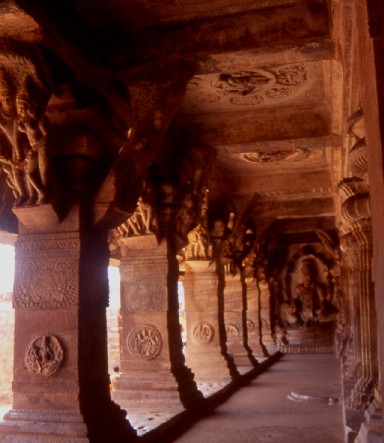 Pattadakal then. Twenty-two km and a 45-minute bus ride away. Our trusty guide said that buses from Pattadakal to Badami could be had later than buses from Aihole to Badami, which stopped at 4 p m. It didn't say much about buses from Pattadakal to Aihole. Enquiries revealed that there was a 4 p m bus, but since it was already 3.30, we were unlikely to catch it. We decided to investigate first, and plan later. Not always a wise idea. Pattadakal is really no more than a couple of shacks on a road. There must be a village, but from here, the central bus stop and the entry to the monumental enclosure, it is not evident. It is a world heritage center, mind you. Manicured lawns, neatly laid pathways, ever-present security, lengthy explanatory notes for each monument, drinking water and toilets are all provided. Despite the manicured lawns, I found this enclosure a most delightful place. The ruins are in reasonably good shape, the crowds are conspicuous by their absence, and there is quiet, greenery, and sunlight surrounding the temples. Pattadakal and Aihole are both historically important - Aihole more so - as the playground of the first Hindu temple architects. Here they experimented with shapes, plans, ideas. From here evolved the various types of shikaras; perhaps even the erotic sculptures of Khajuraho were born here, for there are a few of these to be found here. It is an exciting thought. And the evidence is clear. There are temples with pyramidal shikaras, and the typical south-Indian curving shikaras, and some with no shikharas at all, though that may not be the way they were built. There are several small, simple temples, and two large, imposing ones - The Malikarjuna and Virupaksha Temples. The Virupaksha is a practicing temple, and the Nandi facing it is obscured with all the paraphernalia of puja, so there is not much to admire. The Virupaksha temple is absolutely beautiful inside, with lots of small, delicate sculpture adorning the columns, which in many temples are mostly bare or only mildly carved. Virupaksha also had some gaps in the ceiling. I like to think it was made that way, though I could be wrong. So there was soft light filtering in, and a few diyas in the sanctum sanctorum, giving a delicately mysterious aura to the place. In the perambulatory around the sanctorum, the windows in the corners had plastic stretched across, breaking the daylight into soft colours. There were also tubelights! Thank god they weren't on. Also, luckily, there was no on else there, and no pujari so I could linger at my leisure. Pattadakal is a place which seems to invite lingering. We spent a lazy couple of hours, me exploring every temple inside out, while Amit was content just to sit in the shade and watch the stillness. The tiny Jambulinga, with its circular medallion in the shikhara, Galaganath with the wide, corridor around it, the elaborate Virupaksha and Malikarjuna and the headless Nandi draped in brilliant sunshine outside the Sangameshwara - each temple had its own speciality, its own allure. We headed for Papanath Temple last, since it is slightly removed, in a separate though adjoining enclosure. After all we had seen, this one was unremarkable. No Bed for the Night? It was close to six when we returned to the bus stop, and renewed our enquiries about buses to Aihole. From the varied replies we got, two conclusions were inescapable: Nobody was too sure of bus routes and timings; and it was going to be chancy getting a bus to anywhere at this hour, let alone Aihole in particular. It seems that buses from Pattadakal to Aihole originated in Badami, and our earlier research there had indicated that the last bus to Aihole (also the only bus after 6) would leave Badami at 7.45, and reach Aihole (44 km) around 9.30. Which meant we would have to wait here till 8.30 to catch that bus. This looked like a rather scary proposition. What if we didn't catch the bus? What if the rest house in Badami weren't functional (our Lonely Planet was already a year old)? Sleeping on the pavement didn't seem like a very alluring prospect, and we weren't even carrying our sleeping bags. We waited. Finally a bus came. It wasn't going to Aihole. It was going to Gudur. We waited some more. Another bus came. It wasn't going to Aihole either. It was going to Badami, which was good enough for us. We hopped aboard, and were almost the sole occupants for much of the way. Back in Badami, back to Mookambika. We got a room, lay down and promptly fell asleep. Awoke barely in time for a bath and dinner, and then sank thankfully into deepest slumber. |