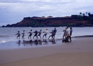 Having seen much of the popular tourist face of Kerala, the idea of a couple of off beat destinations seemed quite appealing to us. We were headed to Bekal Fort, and then on to Valiyaparamba, advertised as a quiet and secluded holiday resort. We knew that this holiday could turn out to be terribly uncomfortable and chaotic, but we didn't let such minor details deter us. A growing sense of adventure was contributed to by the fact that we had neither hotel reservations for any of the nights on the road, nor any return tickets. This was Easter weekend, and also Vishu, the harvest festival and the beginning of the new year, in Kerala. Not only would the state be full of people flocking home for the festivities, but also many establishments – like bus and train booking offices - might be closed over the long weekend. Gamely, we set off anyway, and, having caught an overnight bus to Mangalore, awoke groggily to be thrown off the bus in the wee hours of the morning. We caught the next bus to south to Kasargod and finally another bus to Bekal. Stumbling off on a highway to nowhere, we were pointed down a side road, and found a sign reading "Bekal fort, 0.300 m", which we were greatly relieved to see, since it was the only sign of anything here other than the endless highway. Bekal, often also called Bakel, is one of the largest forts in Kerala. It is over 350 years old. It runs along the beach and has a slightly underground passage leading from within the fort, over the rocks and down to the beach. One face of the fort wall runs parallel to the beach and one sole bastion, like an errant child escaping its parents' protective guard, has run away from the walls and positioned itself atop a rocky outcrop on the very edge of the water, just out of reach of the waves thrashing and writhing in fury below. It was here we spent much of our time in Bekal, watching this raging battle with endless fascination. In the heat of the late morning and early afternoon, cooled by the constant breeze and the occasional spray of a vigorous wave, we watched a fisherman cutting open shells, attaching the worms to his hook and casting again and again; he seemed to have caught only a couple of small fish, hardly worth the effort.