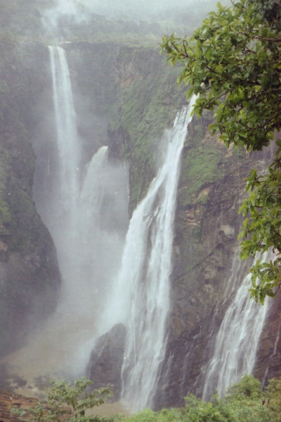 The three main falls all come crashing down into a common pool of rather muddy brown water, about 40 m deep. This is the monsoon - and a good monsoon at that – so Jog is at its best these days. The strains of mist that keep rising, obscuring the falls, then drifting gently apart to reveal them anew, one at a time, only add to the charm of the setting. It rained intermittently, and at times it poured, so, although we had brought our wet-weather gear along, in the interests of keeping the cameras dry, we spent a lot of time under the covered verandah which offered, when the mist allowed, a quite satisfying view of the falls. Finally the rain stopped and we ventured out to do some serious photography. Then, we stopped for lunch at one of the nearby shacks, which offered the extremely appetising fare of bread-omelette, poori sagu, veg pulao and Maggi noodles. This is supposed to be washed down with either insipid coffee or a sugar syrup which incidentally had some tea in it. Thus fortified, we set forth again. Yogish, by chatting with the local vendors, discovered the path down to the foot of the falls. Though we were warned that it would be wet, slippery, mossy and generally treacherous, as it was still raining and pouring intermittently, we decided to be brave and ventured down the path. Down and down we went and then we went down some more. The path was easy enough, consisting of stone steps, many of which had water rushing over them and not too many mossy, slippery bits. But it certainly seemed never-ending – and this was only the way down! (Though whether the way down is worse or the way up is a moot point.) At first I stepped gingerly, trying to avoid the gushing little streams and tiny cascades that came my way, in an attempt to keep my feet dry. Soon I had to give up the unequal struggle and resign myself to a day of wet feet. After this the going was much easier. Vendors at the top warn (apparently in an attempt to persuade you to buy their wares, consisting of snacks and cold drinks) of a 4-km trek “up-and-down”, which is likely to take two hours. The trip down took me about 45 minutes, but this really depends on where you stop. Amit, still trying to keep his feet dry, stopped when we were so far down that we were actually walking in a stream which ran across the sloping valley floor to join the main pool of water. Crossing this stream would mean getting wet up to mid-calf level at least. I persevered (once the feet are wet, wet jeans is hardly sufficient disincentive) until I was in up to my knees and under threat of being in up to my neck at the next step in case I lost balance and fell. Then, reluctantly, I turned back. I had joined a confluence of streams pushing their way past bushes, through rocks and over and under stones of all shapes and sizes, in their attempt to get to the main pool of water. I had been part of that movement, but, unlike the rushing waters, I had not made it. Getting soaked and then facing a 12-hour journey before getting dry again, was a daunting prospect. We started the long, long ascent, but it didn't seem so long on the way up. The steepest parts were at the bottom, and once past those, it was only a matter of keeping on going and soon enough you would get there. It took me, in fact, just a few minutes less than the trip down, despite a few brief breaks for the heart to slow down and the breath to catch up. At one place on the way up, we were faced with a sheer sheet of water pounding down a 15-foot vertical rock face. The water had cut steep, uneven steps in the rock. No way I was going up that, I thought. Besides, I hadn't come down that way, surely. A look around revealed the truth. The path took a detour around the vertical section, crossing the neck of the miniature waterfall at the top, by means of a narrow ledge that led to a few palpitations but nothing worse. And then we were back at the top, hearing the vendors shouting “up-and-down 4 km” in three languages without pausing for breath. We stopped for a cool drink, as I squeezed out my sopping socks and put them on again. Then we reversed our steps of the morning – bus to Talguppa (the same vehicle, in fact, whose brakes did not cause any further delays, luckily), toy train to Shimoga (the same Guard, as chatty as this morning or more), and finally, the late train to Bangalore. Amit, to my horror, changed in the train (the umbrella not having been sufficient to keep him altogether dry “up-and-down”) with the aid of naught but a towel. My raincoat having been rather more useful, all I had to do was to get out of my wet socks! Tired but happy, we went to bed and were all asleep in no time at all. |