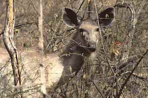 A futile exercise, as I well knew: At 5.30 a.m. when I was still deep in my dream, we were woken by a firm knock on the door and an unwelcome voice announcing morning tea/coffee. An hour had passed, and by now we were all wide awake, riveted by the landscape and shaken by the incessant jolting of the jeep on the rough track. Though we were on the lookout for any interesting animals that wandered our way, I, for one, was just dying to meet some tigers. Spotted deer were the first to cross our path, but these were less than exciting; I had seen so many of them in earlier safaris in another national park. A tiger, now, I had glimpsed only once before, and that all too briefly: I had not even a single photograph by way of documentary evidence of that encounter. |
