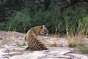 She was a young tigress, our guide informed us, not bothering to lower his voice greatly. She was about 18 months old, still a cub. Her mother, named the Lady of the Lake, was one of the oldest tigresses in the reserve. She had a brother, who had been spotted a short way ahead, on the other side of the path, also well hidden in the bushes. And where was Mama? She must be away, patrolling her territory and scouting for dinner, said the guide. Breakfast, he pointed out, was probably close at hand, as evidenced by the crows circling above, doubtless hoping for a free brunch. We waited. Time passed. People spoke in muted voices. In every vehicle people stood on the seats or perched on rooftops. There was no breeze and it was getting hot. A mongoose appeared and scuttled around, seeming to be perilously close to and entirely unaware of the tigress. Suddenly, to everyone’s tremendous excitement, she got up. She was moving! Alas – away. She disappeared deeper into the grass and we could not see her at all. Some vehicles left. Others moved around, hoping to get a glimpse. We moved forward, to where her sibling had been spotted deep in the undergrowth. We could just make him out, lying on his side and twitching his ears, swishing his tail, stretching lazily and sometimes brushing his face with his paw. In the dark, cool greenery, we could tantalizingly make out his movements, but could not really feast our eyes on him and photographing him was out of the question. Then, out of nowhere – the mother! My first thought was: she’s huge. Where she came from we never knew, but suddenly she was there, lurking in the grass just off the track, clearly visible. Our driver had confidently asserted that the tigress cub would eventually cross the track to join her brother on our left. Now, just as we were all busy shooting her mama, she appeared out of the grasses on our right and strolled on to a bare rock a mere 20 ft from us. Here, she settled herself comfortably and surveyed her kingdom with supreme indifference to the vehicle-loads of tourists gaping at her. Cameras whirred and clicked as she lazily swung her head this way and that. Without warning, she rose all at once and came trotting purposefully straight towards our jeep. In that moment, my fingers froze – not out of fear (she didn’t seem aggressive) but out of sheer stupefaction. The photographer in me was completely overwhelmed as I watched that big, beautiful golden cat padding straight at me as though she wanted to jump right in and share the leather seats of the brand new Gypsy with us. Then she veered to her right and went around the front of our jeep, just 5 ft from the bonnet! In an instant she was amongst the greenery on our left, under the watchful and disapproving eye of mama, who still lurked in the bushes close to the jeep. Both of them turned and disappeared into the bushes; the cub was lost to sight, the mother only just visible by the movements of her ears and tail. But the excitement, the tension, the unmistakable thrill of that all-too-brief moment when she crossed our path – that was as unbelievable as it was unforgettable. A few minutes later, we moved on. We had a prescribed route to cover and reaching the exit gate late would incur the wrath of the forest wardens and a Rs 500 fine. Besides, who knows what other treasures awaited us in the forest?