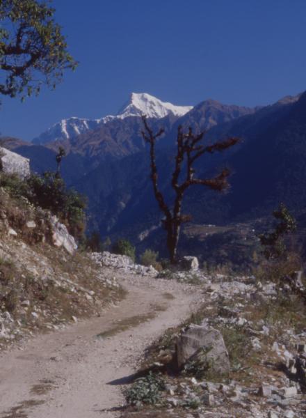 Yesterday evening was full of anticipation. The lodge at Loha Jung Pass accommodated our large party in three spacious rooms that were cramped when everyone was indoors. Live music and (dead) lamb curry were the main entertainers. The sun sportingly gave us a spectacular sunset, painting Nanda Ghunti in shades of gold. This morning, there was a hearty breakfast and then a leisurely departure around 8.30, once everyone had sorted out their stuff and decided how much would be loaded on to the donkeys that would accompany our group. The first day's walk was easy going. We covered about 8 km from Loha Jung Pass to Didna. The first 4 km to Kuling was virtually flat walking, with good, clear views of Nanda Ghunti all along. Kuling is a hub of activity with potatoes strewn in every direction. If one were to pick up every unclaimed potato one came across, it would comfortably feed a family of four for a month. Needless to say, this is potato farming area and Kuling is the junction where donkeys and jeeps meet. We stopped for tea and then carried on. A left fork from Kuling takes you to Wan (pronounced like something closer to Vun, the Hindi word for forest), and for Didna you must avoid the left and take, instead, the right and then go down, down, down and down some more to the valley floor. Then you cross two rivers, both of which have bridges. At the second crossing, a villager indicated that we should avoid the bridge and cross the water by stepping carefully over the stones that were just barely submerged. This we did, but it proved to be entirely unnecessary, as the bridge would have served just as well and a little better, being only a few steps downstream and a lot more reliable in avoiding an unintentional bath. Then it was up, up, up and up some more. Finally, Didna! We approached over a stone wall, across a field and around a barking dog who seemed, strangely enough, disinclined to bite. Here, there was a two-storey stone hut, with a kitchen on one side and stable for the donkeys on the other on the ground floor, and three bedrooms on the first floor. Bathroom facilities were out in the open, which was not so easy because there was a small settlement here, so there were plenty of people around. We reached Didna around 2 pm, had a late lunch around 3.30, then sat out the afternoon and stood around and stamped our feet in the evening till dinner time at 9. It was chilly by then and we were all quite happy to get into our sleeping bags and some even wished that the donkeys could join us, just to warm things up a little. |