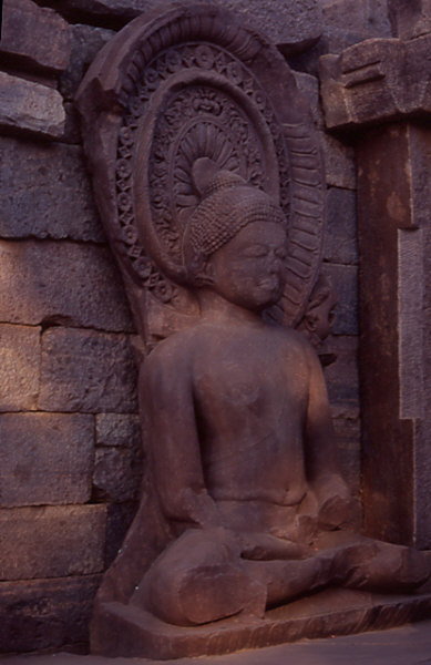Inside, there was a narrow ambulatory passage, with the massive bulk of the stupa rising up to your right (if you walk in a clockwise direction, as you are supposed to). A flight of steps took you one level up, where you could walk around the dome again. Though this balcony was at quite a height, it was less than halfway up the dome to the platform and small structure at its top. Those were inaccessible. Stupa 1, the earliest of the stupas at Sanchi, dates back to the third century BC. It was built by the famous Mauryan ruler, Ashoka, and has the distinction of being the oldest existing stone structure in India. Other Stupas, monasteries, temples and sculptures in Sanchi were added over the following centuries. The stone screen and the toranas of Stupa 1 were also added later, in the first century BC. Smaller stupas were scattered all around, but there were only four large stupas, of which No. 1 was the largest and most impressive. No. 2 stood well away from everything else, in a serene, almost hidden setting of its own. Not all of the stupas at Sanchi had toranas and only No.1 had the stone screen around it. Stupa No. 1, strangely enough, was not at the highest part of the hill. At higher ground, to its east, were the remains of ancient monasteries and a temple. Low walls and the stumps of pillars showed how the area must have been divided into rooms and corridors. The superstructure, presumably wooden, had not withstood the ravages of time. Tucked away in an open corner of one monastery was a larger than life statue of Buddha, sitting in his customary pose, with his back against a wall and his knees folded, engrossed in eternal contemplation. It was clear that this was not his intended place: he had been kept here to rest and seemed to be quite at home in this peaceful, open area. He had an almost human figure with a sublime smile and expression of all-encompassing peace. When I stood next to him, I found that I was only a little taller than he was sitting down and his massive face was significantly bigger than mine. I gingerly put out my hand and touched his cheek. It was warm, like a live person's might be, and firm, strong, enduring.