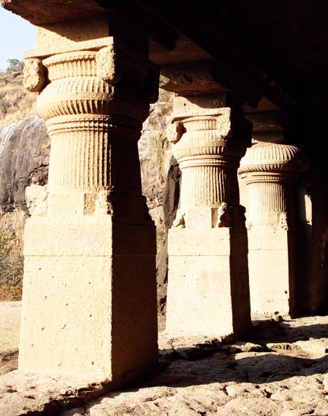 Cave 32 is known as the Indra Sabha cave and is the most famous of the Jaina caves. A small group of tourists was just entering it, so we went to Cave 34 first, which was deserted. There was a staircase just off the entrance hall and I climbed up it almost absent-mindedly, leaving Amit in the depths of 34. The stairs led, to my surprise, up to unseen halls and staircases I had not suspected, and thence, after a short passage brought me to the top storey of Cave 32. These pillared halls were breathtakingly beautiful, softly carved and glowing softly like warm gold in the late afternoon sunlight. There was a sense of peace and quietude here that was not to be found in the crowds milling around Kailasha or any of the more central caves. At last we walked back down the tarred road, towards the Brahminical caves. Cave 29 was a short diversion away, but we wanted to be back at Kailasha and adjacent caves to take advantage of the burnishing light of sunset to get a few good pictures, so we skipped this for the moment, intending to come back to it the next day. I did take a short detour to caves 20-27, to see whether they were worth coming back to and also to investigate the possibility of taking a shortcut over the hill to cave 29. It looked difficult: the path from 27 to 29 was around a curving cliff face with an exceedingly narrow track that looked a bit tricky for a mountain goat and pretty well impossible for big, clumsy-footed me. This path would pass behind a waterfall in the rainy season, which might be slippery and exciting, but right now it was slippery and dry.