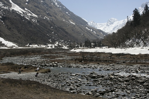 When we finally got out of the room at 7.30-ish, we found Ballu busy rolling out puris to eat with steaming hot chhole (chana; chickpeas). The kids wolfed down eight puris between the two of them, while Amit said he single-handedly demolished 11. I got stale rice. (Sob.) At 9.30, we went for a "picnic". We carried the camera, a bottle of water, a small packet of cashews and raisins, and a big plastic bag full of dirty laundry. I'd mentioned to the kids that we could wash our clothes in the stream at Har ki Dun and for some reason this idea caught Tara's fancy. She was really looking forward to it! Since there was still a lot of snow, going down to the meadow we had come from didn't look like too much fun and going further up looked even less inviting. So we went down to the valley behind - where a small stream curved around the foot of the Swargarohini massif and disappeared in the direction of the Jaundhar glacier. The glacier is only another 12-13 km from here, we were told airily. That was 12-13 km more than I intended to walk, and in the wrong direction to boot. We descended the slope behind our room and picked our way down to the water. We all took off our shoes and socks and eventually the kids took off their pants as well - I worried about sunburn, but the way they were managing to get their pants wet in the river, I'd have to worry about pneumonia soon. We all washed clothes in the stream. Unfortunately, washing clothes in the river is not as easy as you might think. Where the water is fast and deep, it too cold to stand in. Where it's shallow enough to keep your feet dry, it's full of silt. Tara was dipping a sock in the water when it slipped out of her hand and started to float downstream. Only with some good luck did I manage to catch it before it drifted lazily away. "Some of our clothes are going to reach Osla before us," observed Amit. The kids enthusiastically silted up their laundry; I tried to de-silt it and rinse it clean. Amit spread it out on the grass to dry, so that it picked up all sorts of things; I tried to rinse it clean again and then lugged it all the way to a far off rock to dry. Then the kids had a blast playing with stones and sand and water and we had a blast watching them. They tried their hands (and feet) at rock climbing and Amit stood guard behind to ensure they didn't fly off the top of the rock and land in the roaring river behind. We munched the dry fruit and drank the water and I showed them how to fill water from a stream. They were so delighted because they could empty the bottle out into the stream and fill it up again and nobody would scold them for wasting water! We went back up the thorny hillside for lunch and after lunch the kids were persuaded to take a nap. Amit went to the GMVN guest house to see if their room was any better than our current room with the smelly quilts; we had a reservation there for that night. He discovered it was much better - larger, cleaner, and with a nice window and a nicer fireplace that the staff promised to light a fire in at night. He also discovered a back route between the GMVN guest house and the Forest guest house. When the girls woke up from their nap, we packed everything and moved. Ballu refused to follow - packing the kitchen was simply not worth the effort, he said. So we came back to the Forest guest house for dinner. By the time we went back to our palatial lodgings at the GMVN guest house, it was dark. Naturally, we lost our way and were stumbling around in a maze of boulders and snow when the staff from the GMVN guest house sent out a search and rescue mission for us. By 8 p.m. we were in our room, the kids were in bed, the fire was blazing and the quilts were mercifully odorless. Of course, when the fire ran out of wood around 9 p.m. the room was horribly cold - but it seemed a small price to pay. |